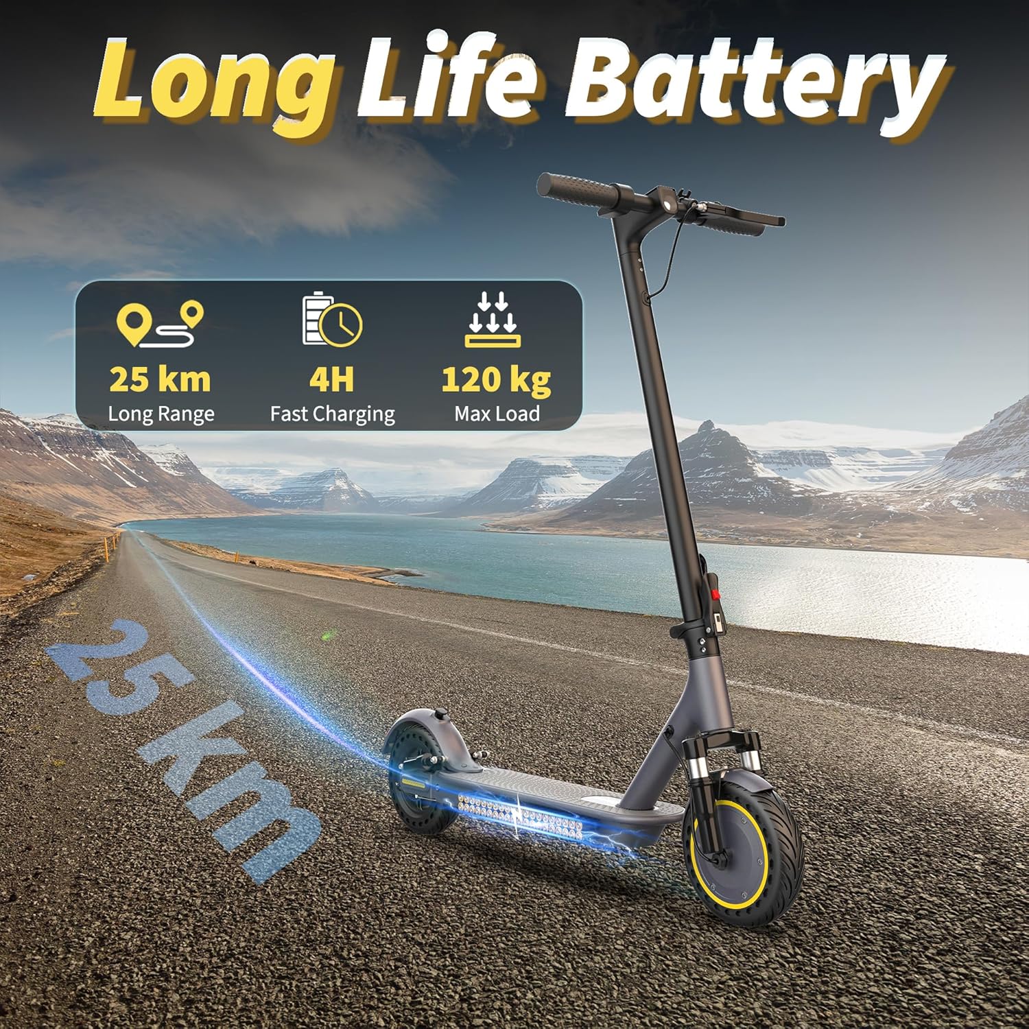 - Powerful Performance: The electric scooter is equipped with a 350W powerful motor and high-capacity battery. Under specific conditions, the speed of the electric scooter can reach 25 km per hour, and the maximum range can reach 25 km. The maximum load of the scooter is 120 kg, and it can easily handle a 15% slope.